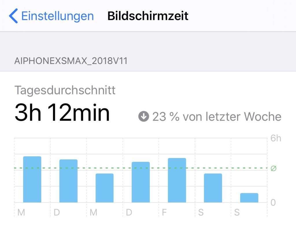 Allerdings bezieht sich der Wert jeweils auf die vergangene Woche. Daher ist zumindest einmal pro Woche (am Beginn, wenn der Wochenbericht erscheint) ein Blick auf die Einstellungen > Bildschirmzeit (bei iOS Devices) sinnvoll.